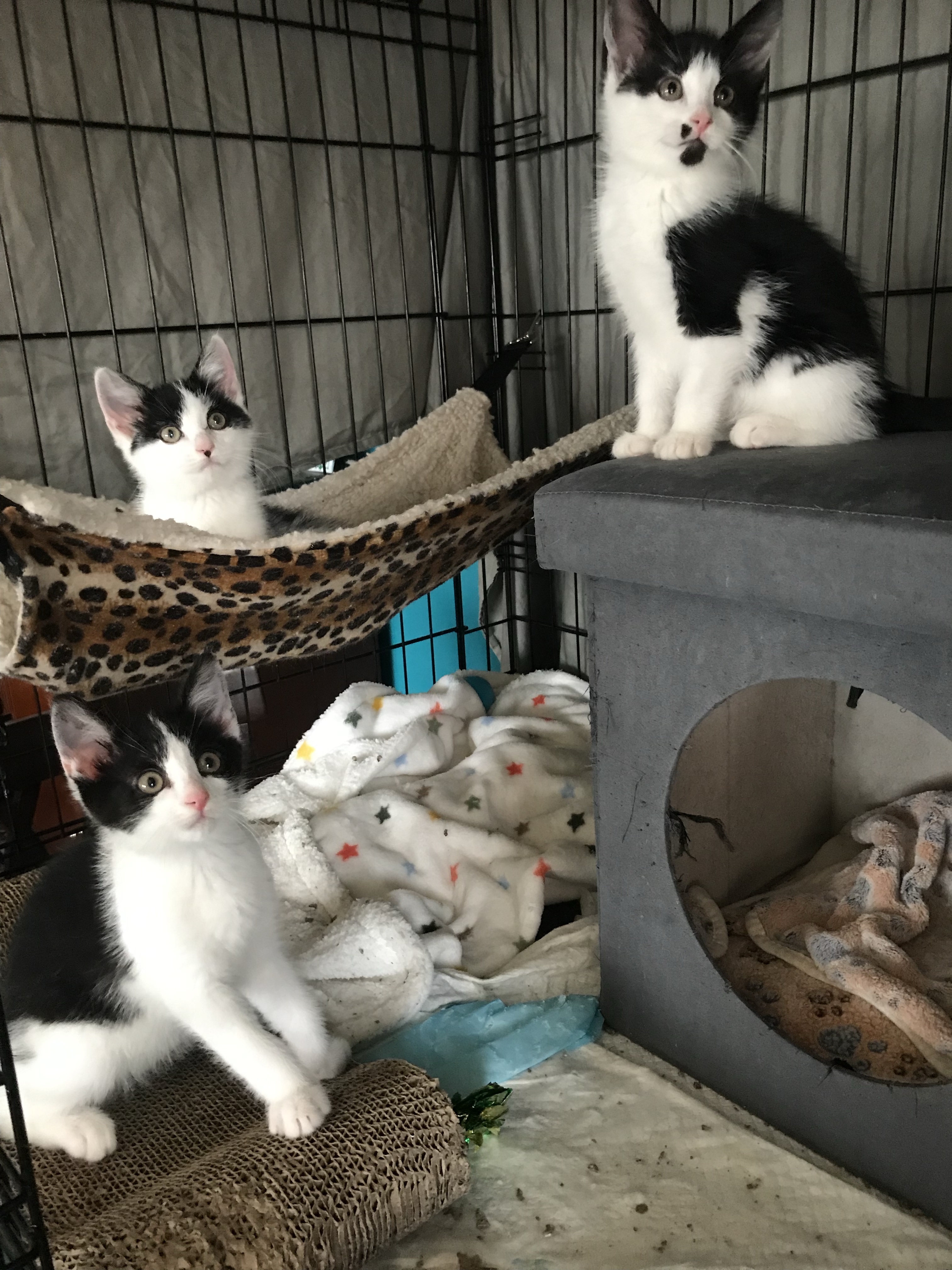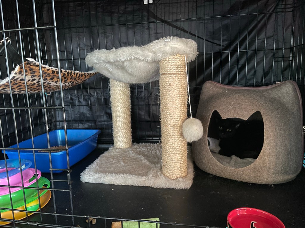 I make sure kitties have a cubby to hide in, along with the essentials like litter box, food/water bowls and if they fit, a scratcher and some toys.