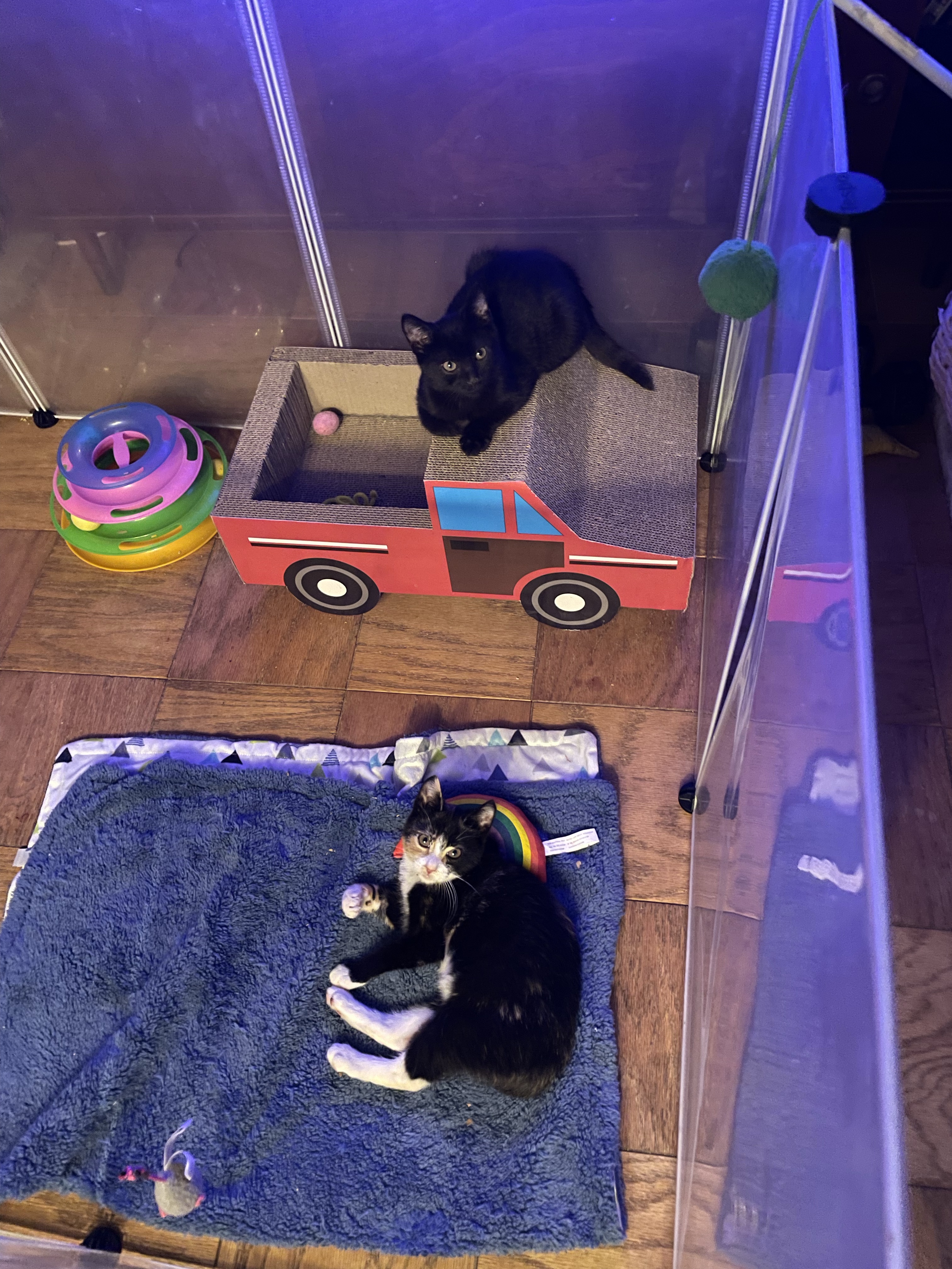 When they first arrive, I usually will put kitties in their new area and cover it up with a cotton breathable blanket and leave them alone to adjust.